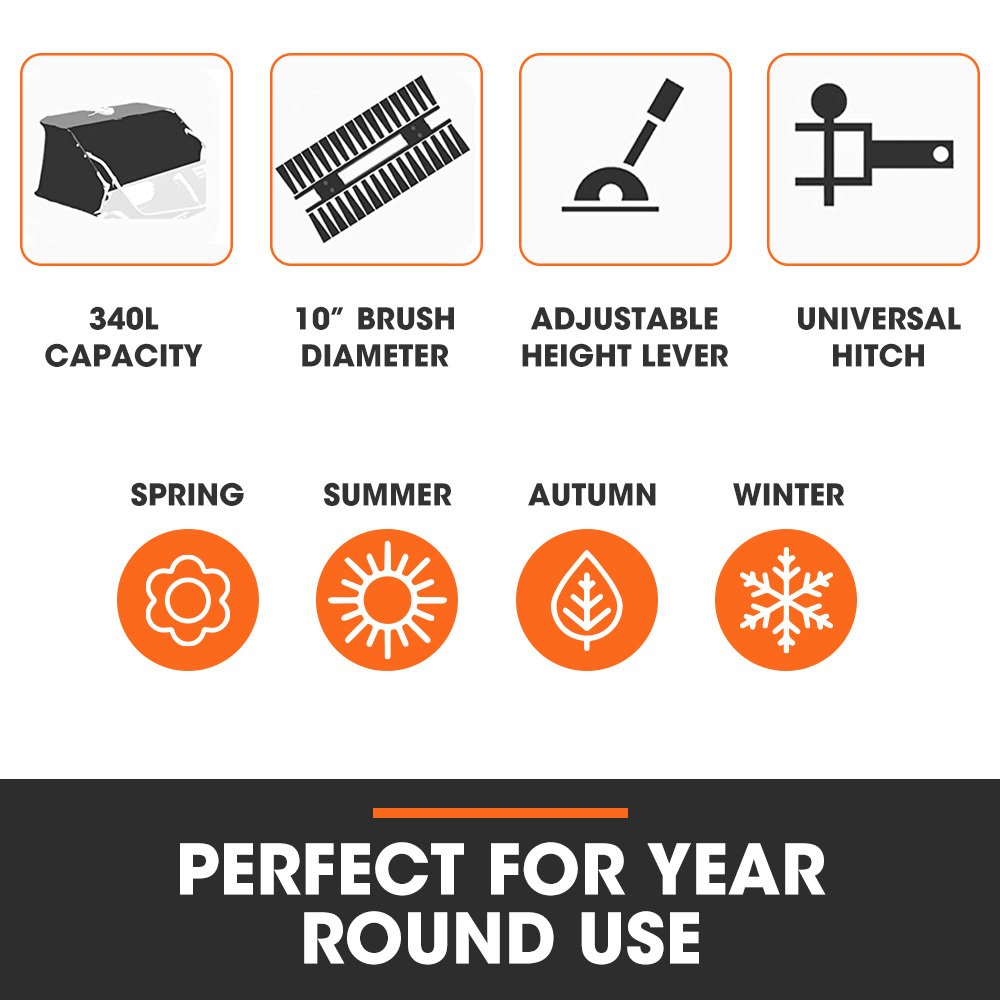 It comes with 10″ diameter brushes and adjustable height to sweep debris from pavement, grass, artificial turf or other garden surfaces. Ideal for picking up leaves, twigs, grass clippings and so much more, this PlantCraft sweeper comes complete with a universal hitch pin coupler, which makes it easy and hassle-free to attach to your garden tractors, ATV’s, and ride on mowers.