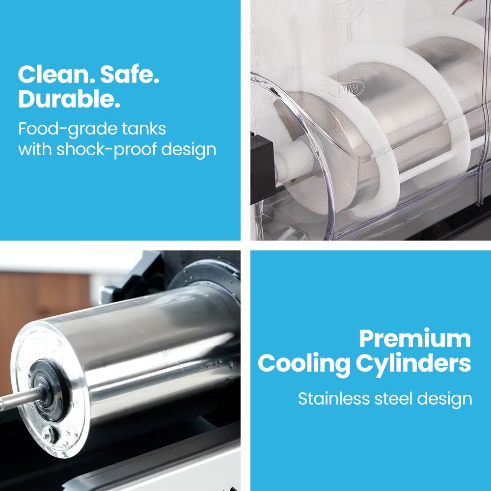 The intuitive digital control panel makes it easy for any staff member to operate, while the stainless steel body and tough shockproof food-grade tanks provide long-lasting durability and hygienic performance. Reliable, high-capacity, and simple to maintain, this machine is a smart investment for any business looking to serve crowd-pleasing frozen drinks with confidence and efficiency.