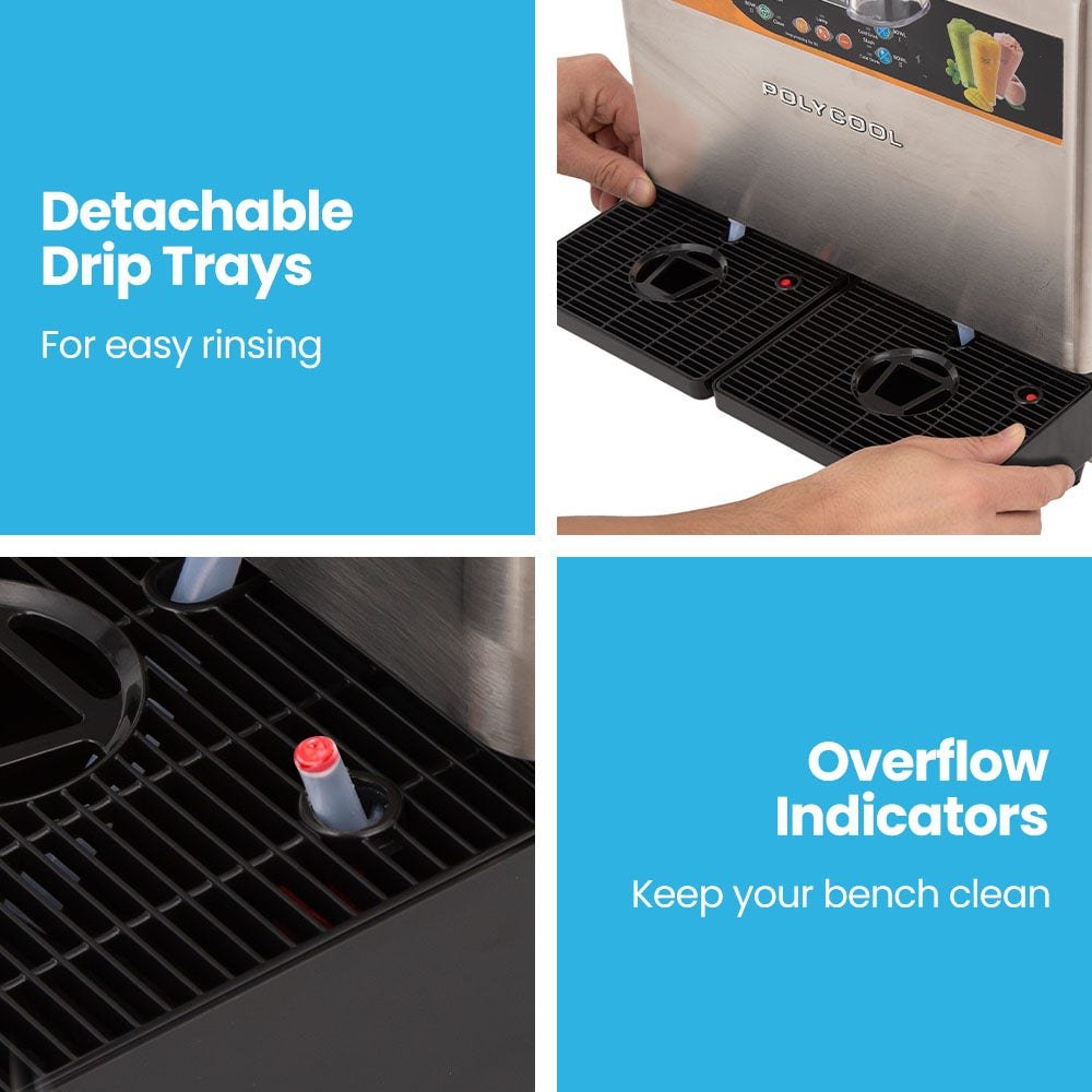 Deliver serious capacity and performance with the POLYCOOL Commercial 24L Twin Tank Slushie Maker. Designed for cafés, restaurants, clubs, food trucks, and party rental businesses, it’s built to keep up with busy service while offering flexibility for two flavours at once. The powerful 850W compressor and twin dual-beater system ensure fast, consistent freezing and a smooth, even texture in as little as 50 minutes, ideal for venues serving steady customer flow and repeat orders.