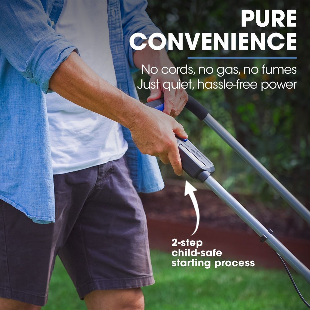 The 350CX is powered by a PowerBlade 20V 4Ah battery, which is compatible across the PowerBlade 20V range. With 5 adjustable cutting height settings, you can tailor the mower to suit your lawn’s needs.The compact lightweight 12kg design makes it perfect for townhouses, villas and houses with small lawns, and the handle ensures it can be easily carried.