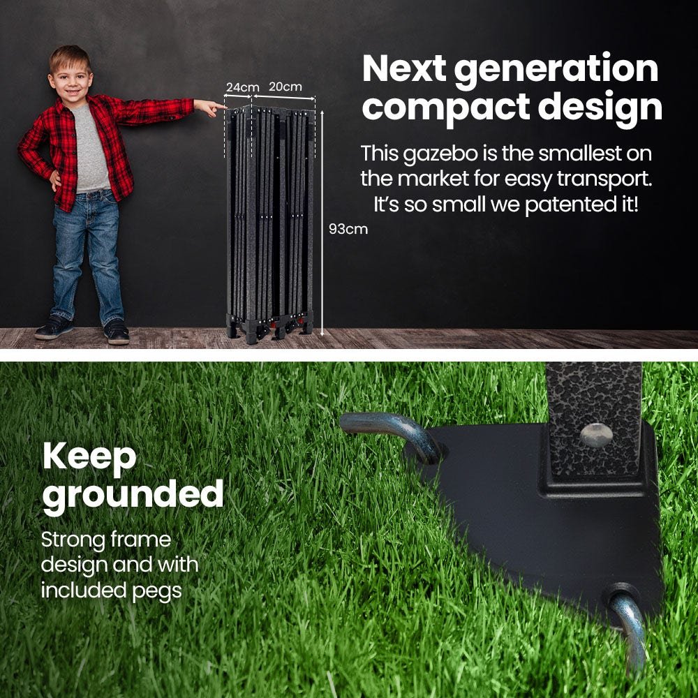 The Red Track 2.2×3.6m Gazebo (with 3 walls included) stands out with the smallest folded size on the market—just 93cm long! This ultra-compact 13kg design makes it incredibly easy for one person to carry, transport, and store, offering unmatched convenience compared to bulkier alternatives. Whether you’re short on space or always on the move, this gazebo’s design ensures portability without compromise.