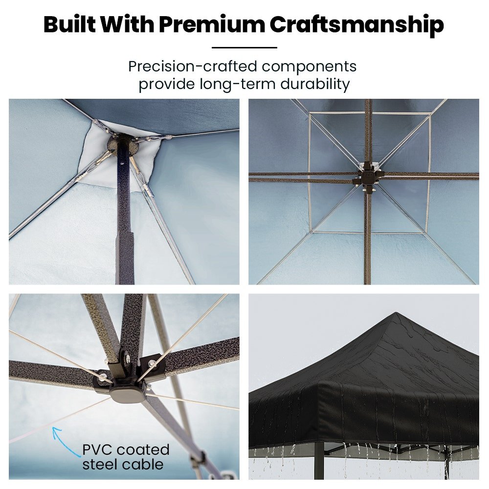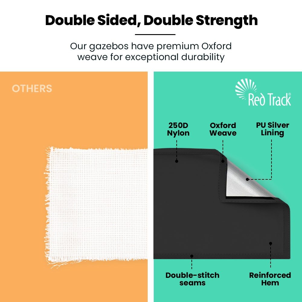 At the heart of the design is Red Track’s patented steel-cable reinforced canopy structure, which keeps the roof tight, prevents water from pooling, and adds exceptional wind resilience. Combined with oversized truss bars and square-tube steel legs, this gazebo offers rigidity you can rely on.