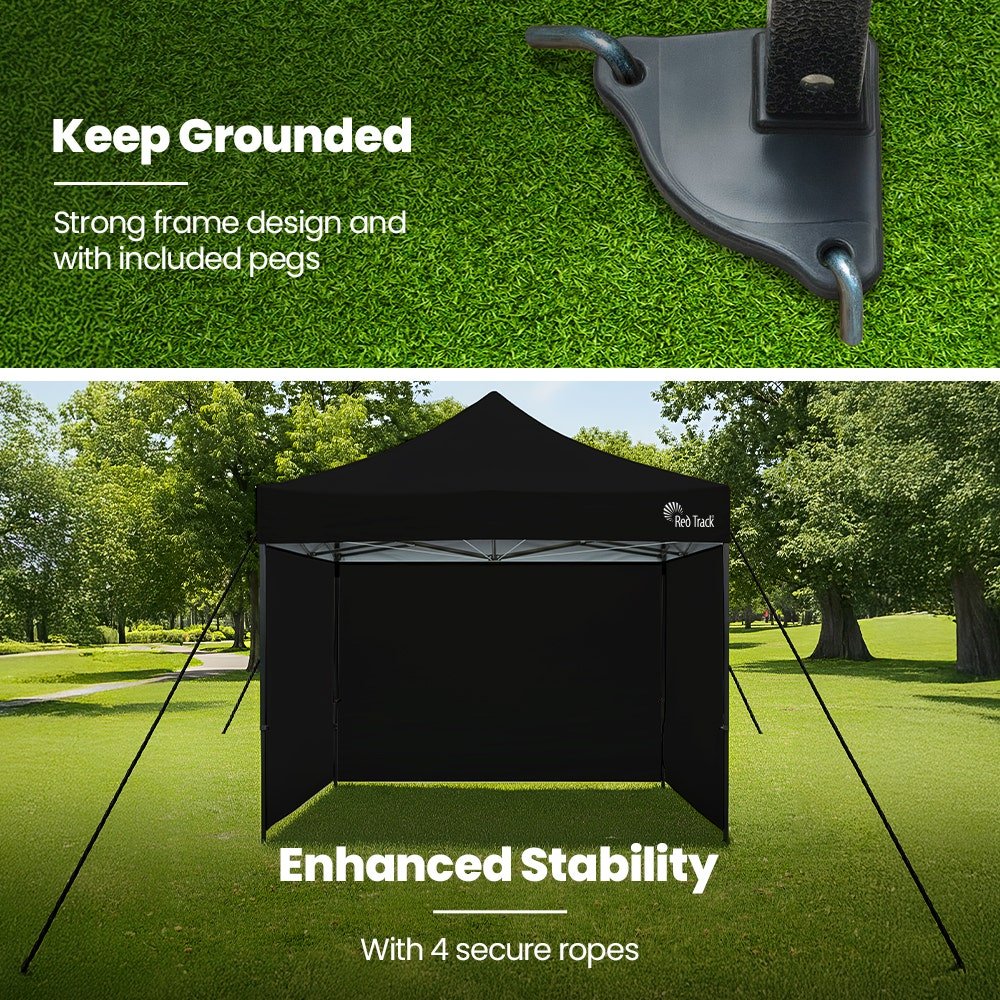 RED TRACK 3x3m Premium Pop Up Gazebo Marquee, Patented Steel Cable Canopy Support System, Wheeled Carry Bag, Side Walls, UV Block, Reinforced Frame, Black