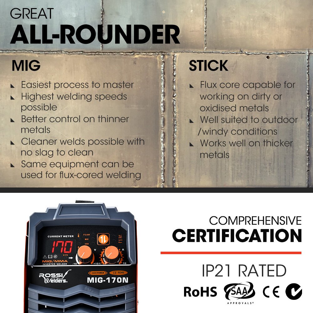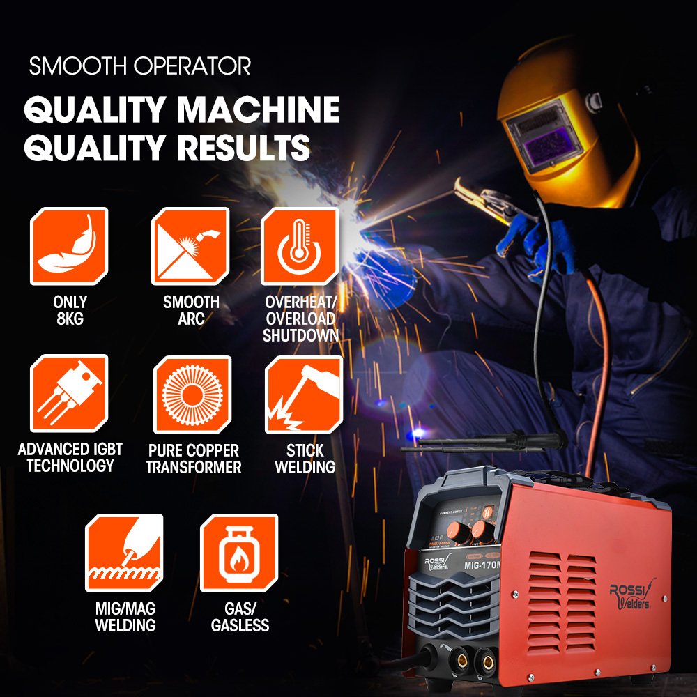 The Rossi MIG-170N – powerful, yet extremely lightweight 170Amp MIG/Stick iGBT inverter welder is a must have for any handyman or serious DIYer. Highly compact and featuring true iGBT DC inverter technology, youre assured an instant start and deep penetration.