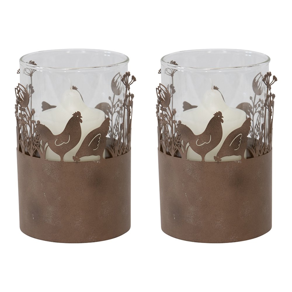 Set 2 Glass Pillar Candle holders in Stilted Rust Base w Chooks 17cm