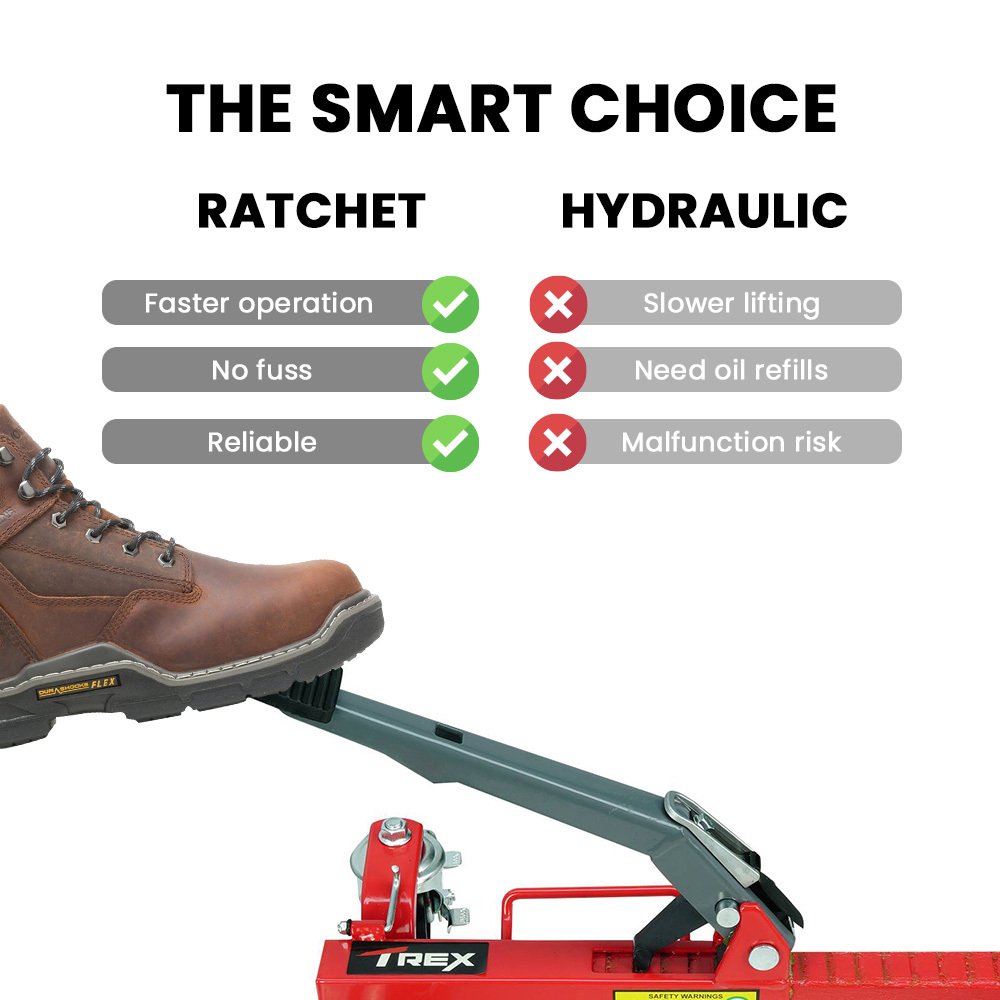 These T-Rex Positioning Jacks feature a foot operated ratcheting lever with a large non-slip rubber pad. This simple system offers an easy lifting action thats faster than hydraulic models! Not only that, you dont have to worry about oil refills and the malfunction potential of the hydraulic alternatives!