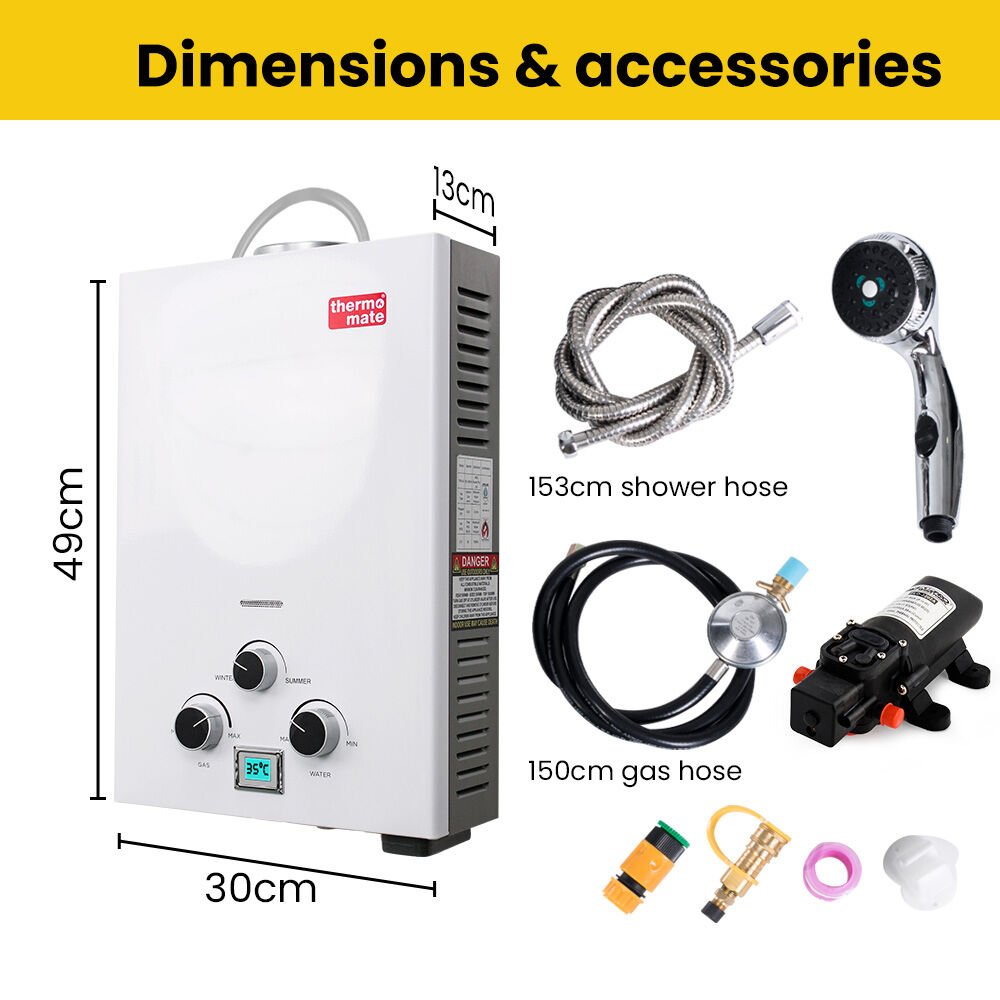 Thermomate Portable Gas Outdoor Camping Hot Water Heater System, with 12V Pump, Shower Head, White