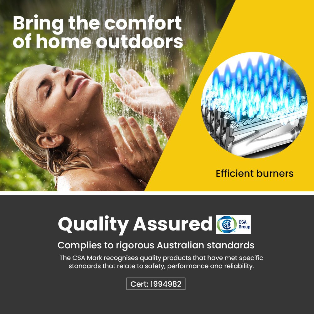 The Thermomate Portable Gas Hot Water System range boasts an intelligent design that will immediately shut off the gas supply when necessary. The unit can detect if the flame goes out, or if it is tilted by more than 45 degrees in the event of it being significantly bumped. It will even shut down if the water flow is insufficient, and for your peace of mind the temperature is limited to 60 degrees. All this means you can simply relax and enjoy a refreshing shower in the most beautiful locations!