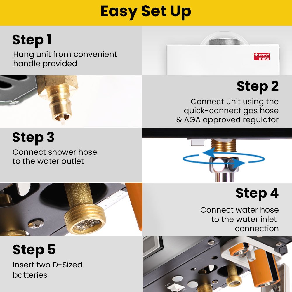 The Thermomate Tankless Outdoor Water Heater delivers endless hot water with optimal efficiency! No electricity is required, making this compact unit ideal for a hot shower when camping or caravaning, or for washing livestock or pets on a remote property.