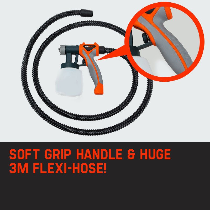 The two piece body is designed to decrease user fatigue, featuring a convenient telescopic trolley handle to make moving the motor around effortless. You simply park it next to you so your hands are kept free for spraying. One of the notable benefits of operating a High Volume Low Pressure (HVLP) system is that you dont need to lug around a heavy, costly air compressor. Moreover, the ergonomic soft-grip handle with multi-directional adjustable fluid nozzle connects to a massive 3m flexi-hose so you can flow through your DIY projects without having to move anything at all.