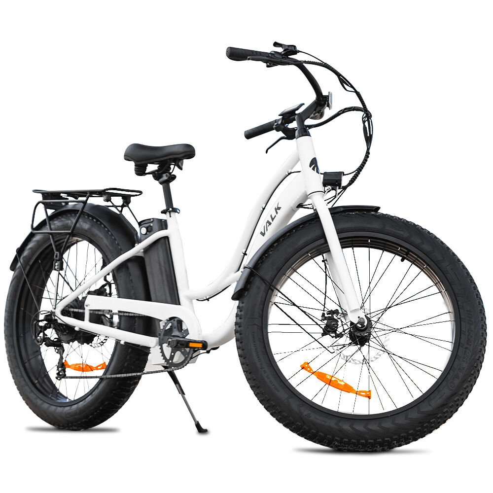 VALK Electric Fat Tyre Cruiser Bike, Step-Through eBike with Throttle, Tektro Hydraulic Brakes, White