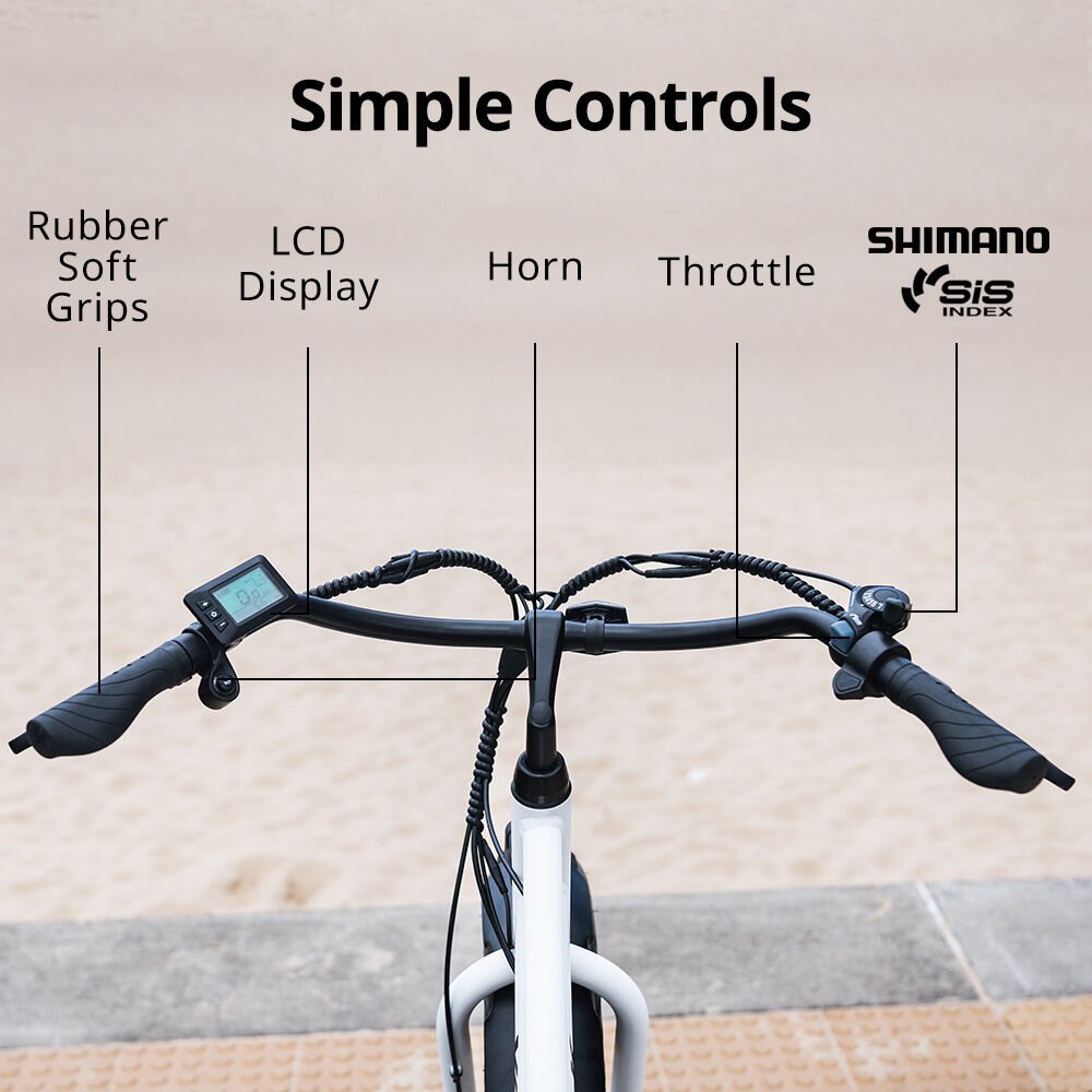 It features an easy-access step-through frame, a premium alloy frame, high-end Tektro hydraulic disc brakes, Shimano 7 speed gears, a headlight that runs off that battery and a handy rear rack for securing your gear. So, grab some mates and hit the beach or discover some new trails!